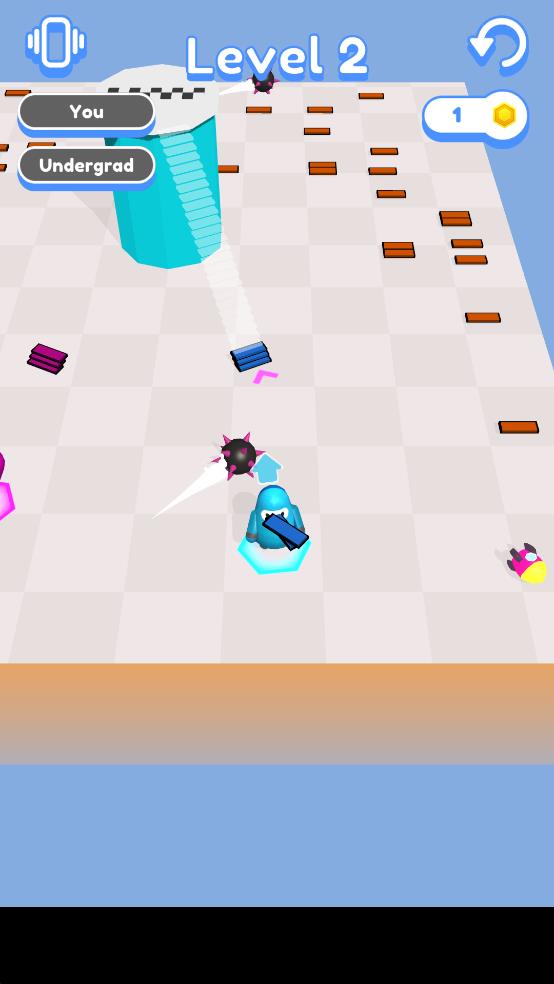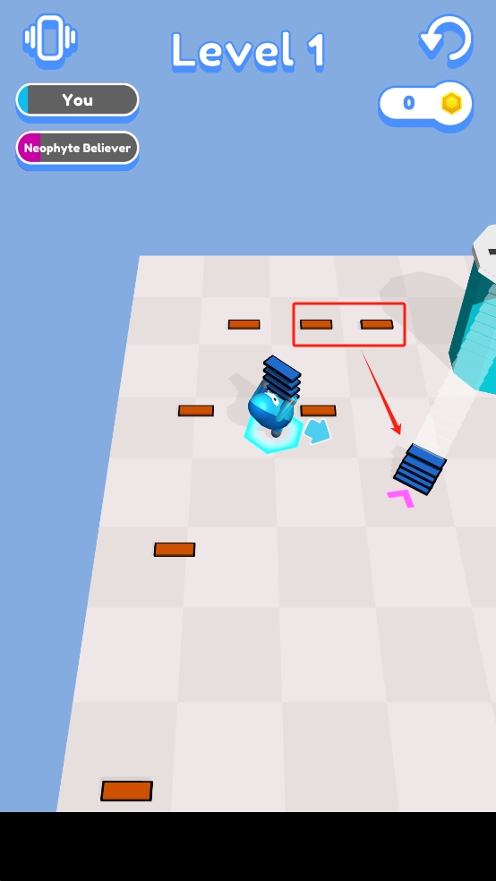 2、操控已堆叠方块的蓝色角色,规划路径,绕过橙色障碍,向右侧蓝色方块移动,准确收集以增加堆叠数量。