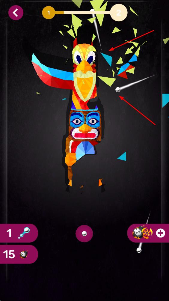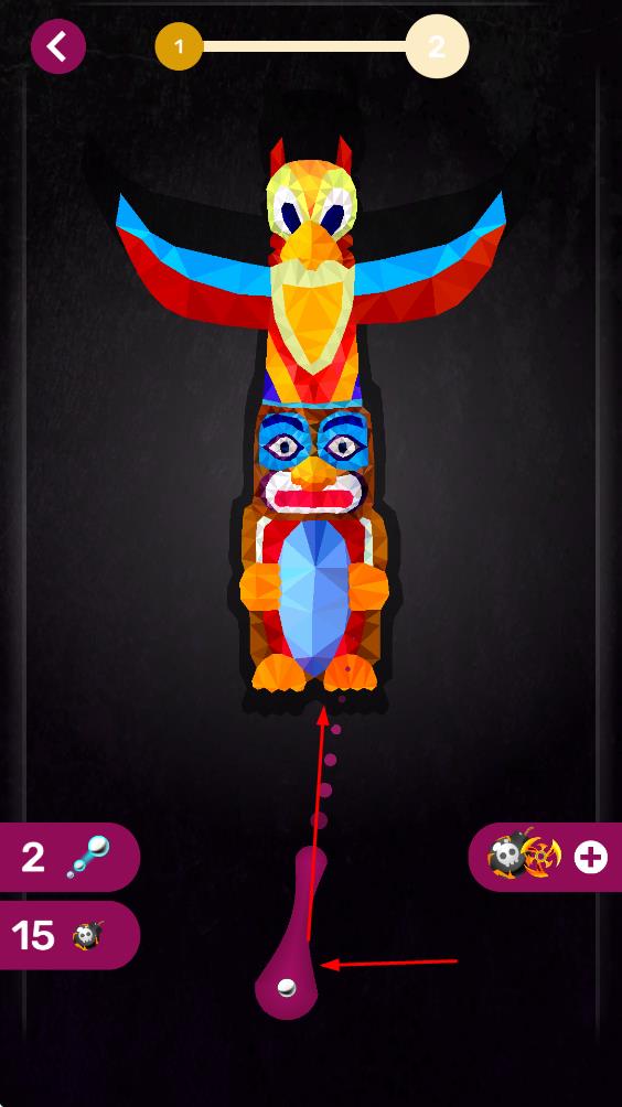 2、点击发射,小球击中图腾使其部分碎裂,同时上方进度条推进,积累关卡进度,为通关创造条件。