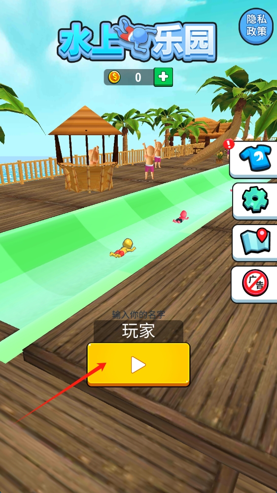 1、在水上乐园游戏启动界面,输入名字后,点击黄色按钮,开启水上滑道竞技之旅可以点击右侧对应的功能按钮。
