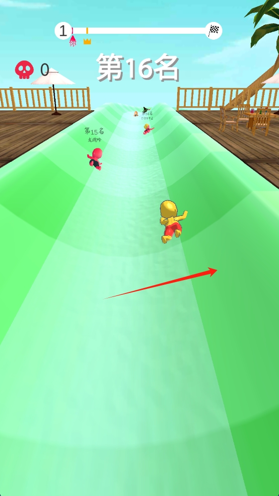 2、进入游戏比赛界面,集中注意力,操控角色在水上滑道快速前进,注意观察赛道进度条和自身名次,同时避免被淘汰。