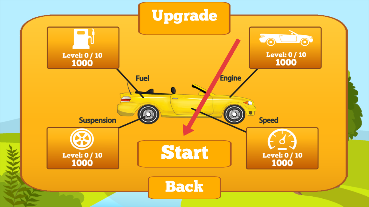 1、点击车辆升级界面中间的Start按钮,开启赛车关卡,后续利用金币强化燃油、引擎等属性。