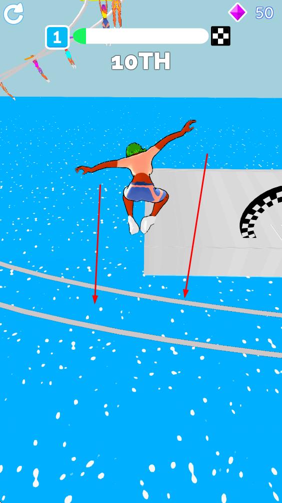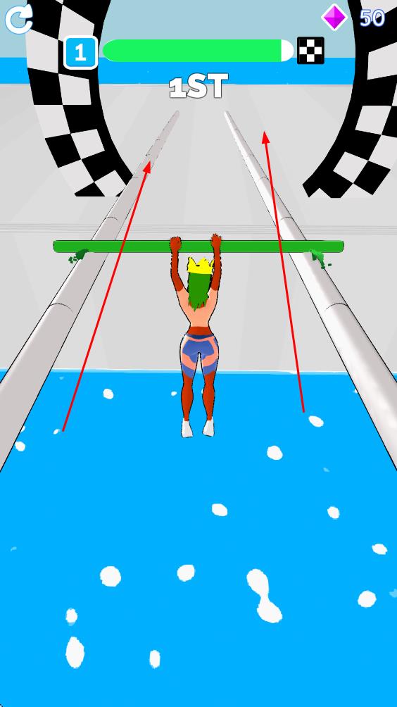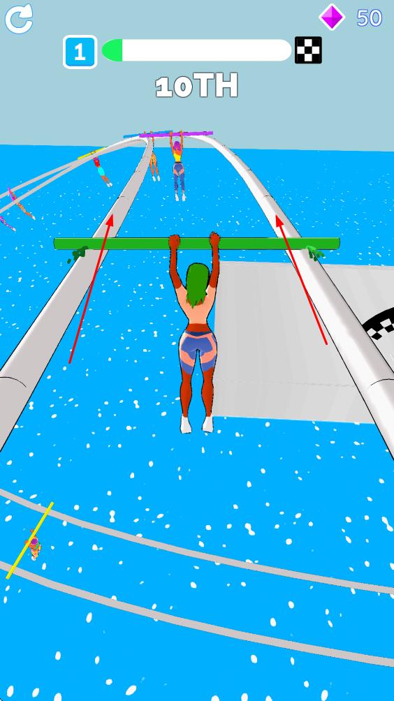 1、操控角色抓握横杆移动,在赛道上超越对手,留意上方排名显示,开启竞速挑战。