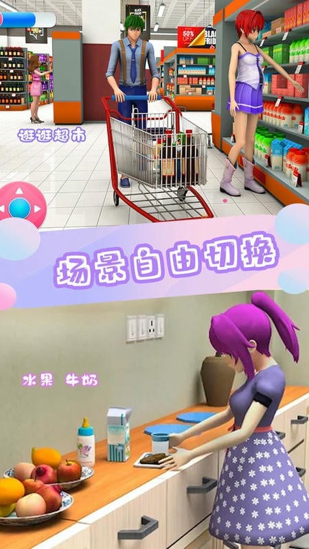 3、自由场景切换:包含家庭内部的多个房间以及公园、超市等外部场景,玩家可自由切换场景开展不同活动,拓展生活模拟的范围与内容。