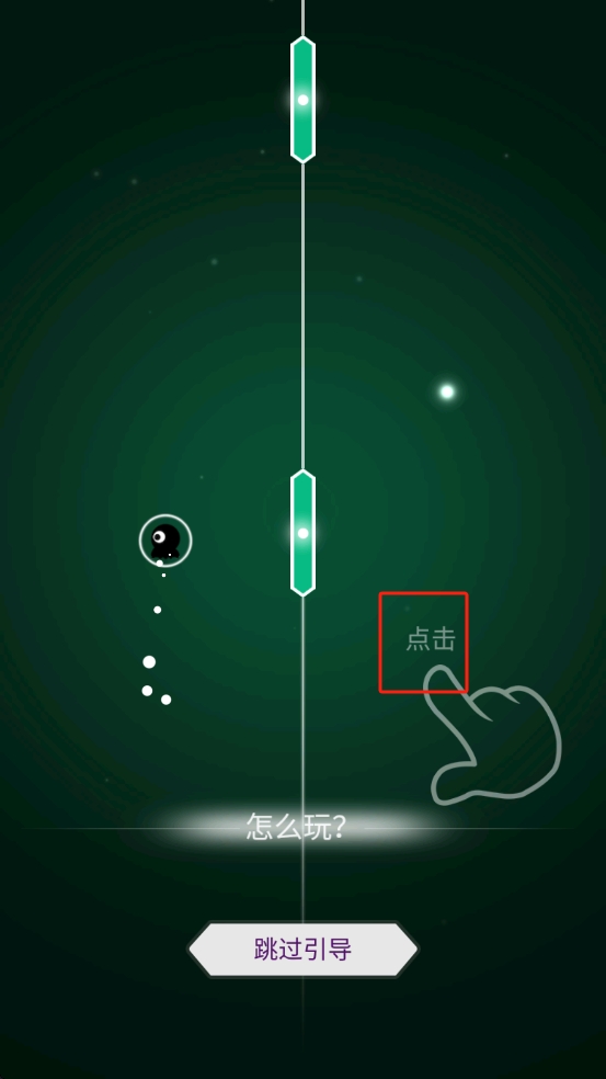 1、在引导界面,按照提示,当看到红框区域出现点击指引时,及时点击该区域,控制黑色小球进行移动。
