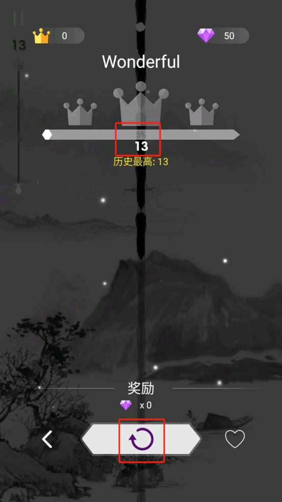 3、关卡结束后,若想重新挑战刷新分数,点击红框内的紫色重玩按钮,再次尝试突破历史最高纪录。