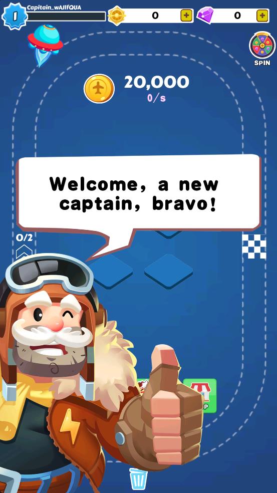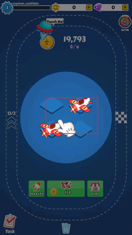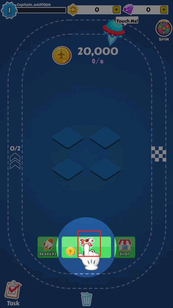 1、初始界面,点击底部红框内飞机图标,消耗金币投放飞机到跑道,让其自动飞行赚金币,积累资源。