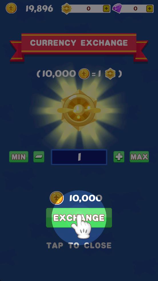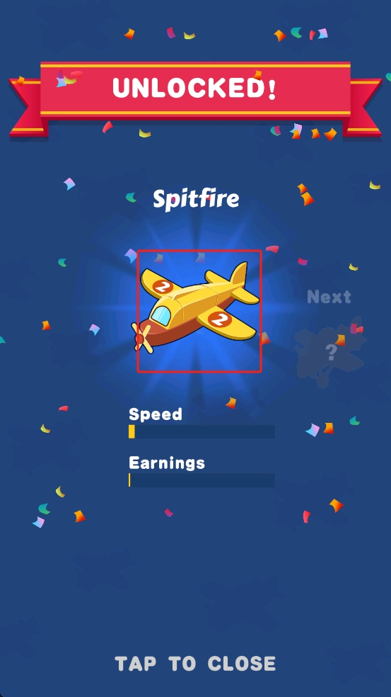 3、合成解锁新飞机Spitfire,查看其速度、收益属性,确认后点击TAP TO CLOSE按钮关闭界面,用新飞机继续赚金币。