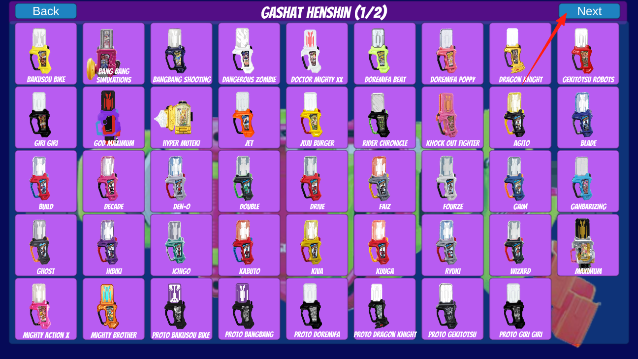 2、进入骑士卡带选择页,里面有好多不同的卡带,选喜欢的卡带,点它装备上,再点Next,就能带着选好的卡带,继续体验变身玩法,换不同卡带能有不同变身效果。