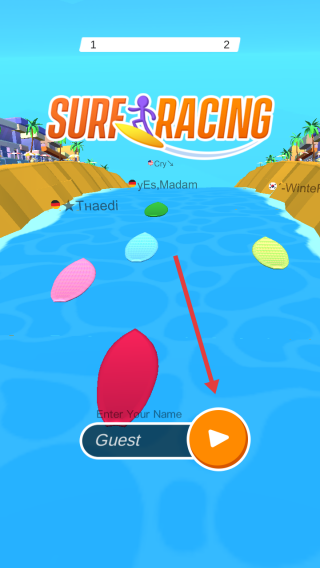 1、点击橙色播放键,以Guest或自定义名称,进入河道赛场,操控冲浪板等玩家开启竞速比拼。