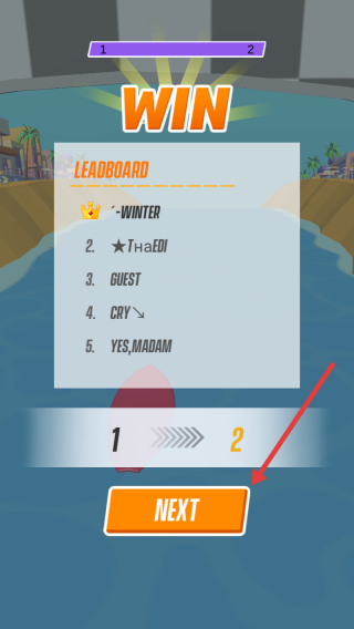 3、冲线后查看LEADBOARD名次,点击NEXT开启新关卡,重复挑战优化路线,积累金币解锁新板,冲击更高排名。