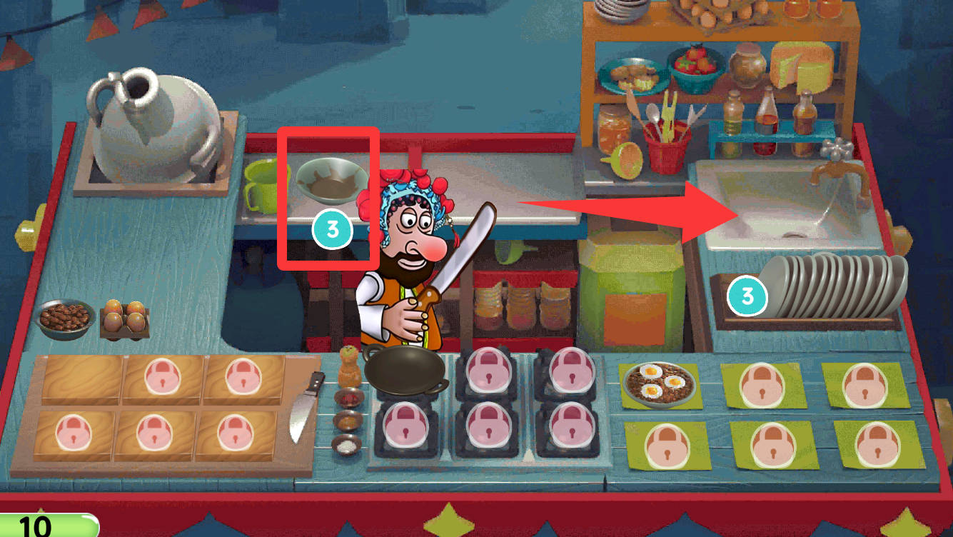 4、红色框框哪里有3个碗要洗,长按移动到洗手盆哪里洗。
