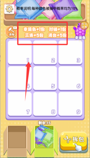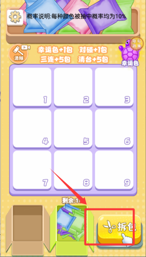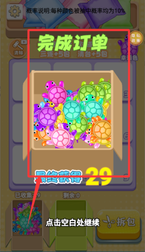 2、点击包装袋拆开获取乌龟,相同颜色的三个一组会自动消除并计入订单进度,注意合理安排抽取节奏。