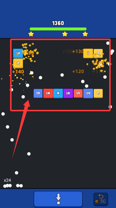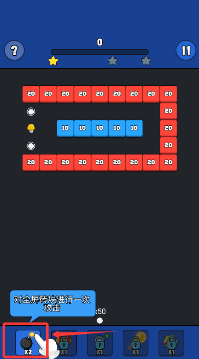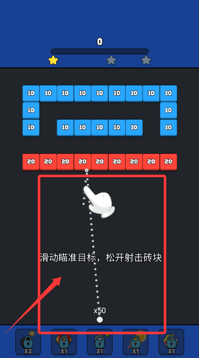 1、开局滑动调整,对准顶部数字方块后松手,发射弹珠进行撞击破坏。