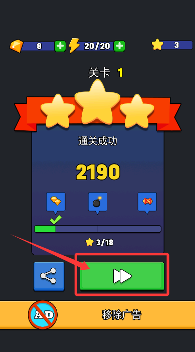 3、清除全部障碍后,弹出结算界面展示星级评价,点击继续开启新挑战。