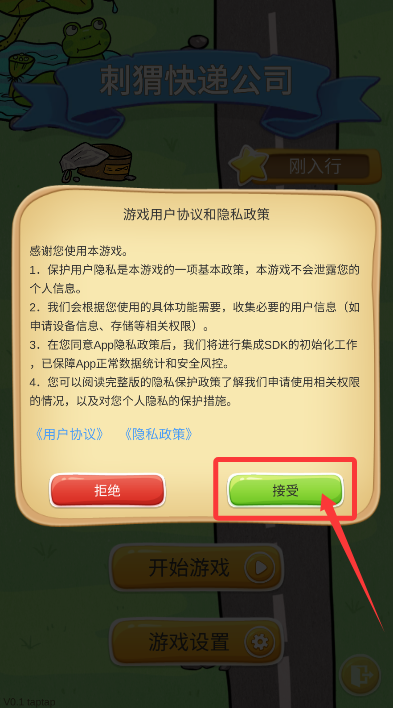 1、初次启动游戏时,系统会显示用户协议弹窗,点击绿色确认键继续。