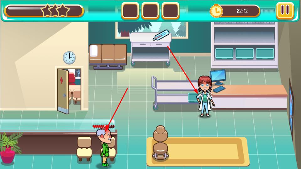 2、在医院场景内,关注等候的患者如头顶标识的老年患者,同时可互动场景道具如诊疗台体温计,筹备接诊工作。