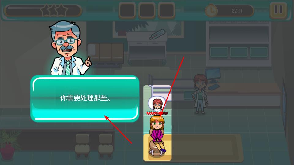 3、依据医生提示框如你需要处理那些,接收待诊疗患者,合理规划流程,完成诊疗任务推进关卡。