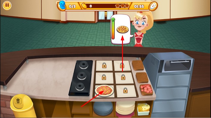 2、在披萨制作场景中,根据顾客的订单要求,在操作台上进行披萨制作,使用各种食材,通过点击和拖动等操作,完成披萨的制作。