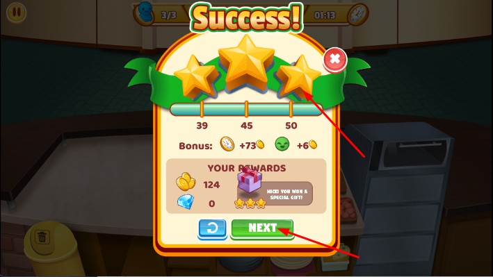 3、在制作过程中,制作时间和顾客的满意度,尽可能快速且准确地完成订单,成功完成订单后,点击NEXT按钮进入下一个关卡继续挑战。