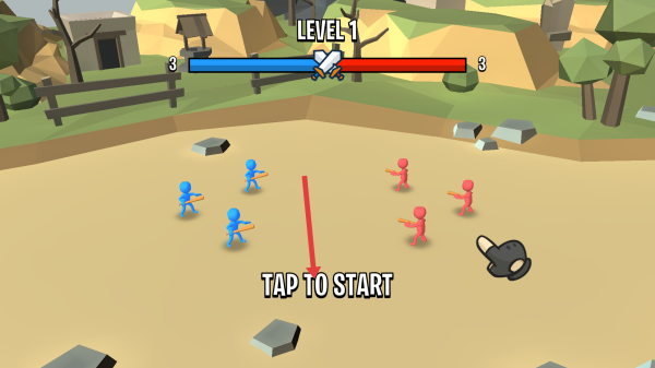 1、在游戏界面中,点击TAP TO START按钮,启动游戏,操控蓝色小人军团与红色小人军团展开对战,开启战斗挑战。