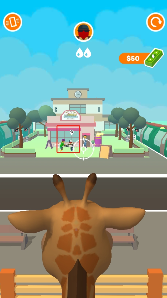 1、操控长颈鹿对准前方红框内的互动人物,精准发动攻击,通过击中目标推进关卡进程,同时获取对应奖励。