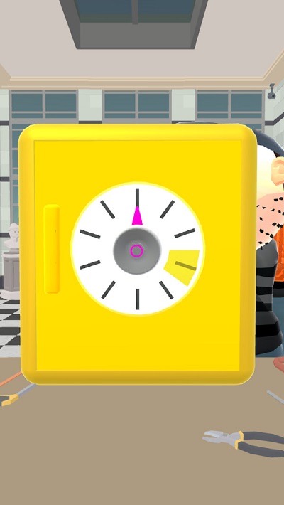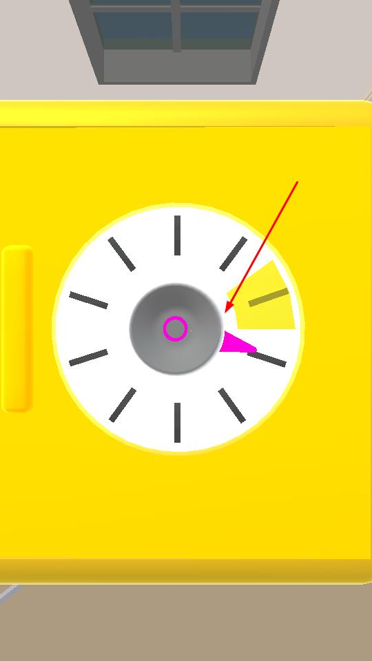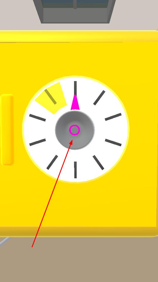 1、面对黄色保险箱的圆形表盘带黑色刻度线,拖动或旋转表盘,先将粉色指针精准移入黄色扇形区域,同时确保中心粉色圆环对齐,操作需精准,否则无法推进。
