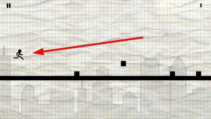2、游戏中,按箭头指引,控制小人向左或向右移动,躲避黑色方块等障碍,持续前进。