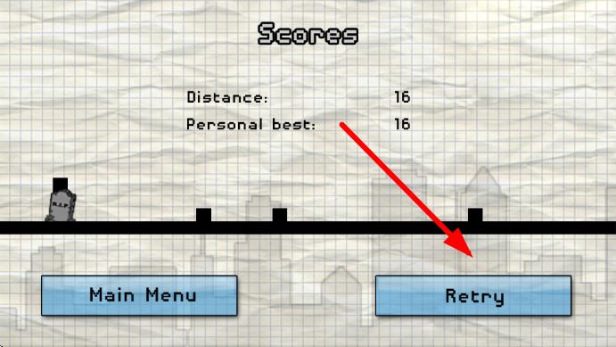 3、若挑战失败,在成绩界面点击Retry的按钮,重新开始游戏,尝试突破距离记录。