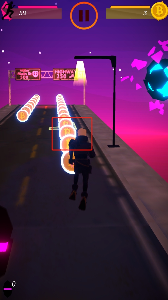 1、操控角色沿道路前行,紧盯红框内比特币轨迹调整移动方向,持续收集金币,留意两侧环境避开障碍,维持奔跑节奏。