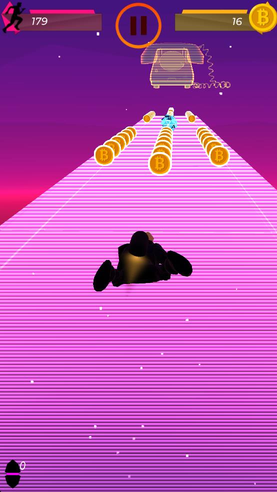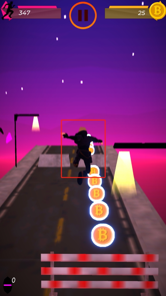 2、遇道路障碍时把握时机跳跃,越过红框内阻隔,继续收集路径比特币,保持奔跑速度,避免进程中断。