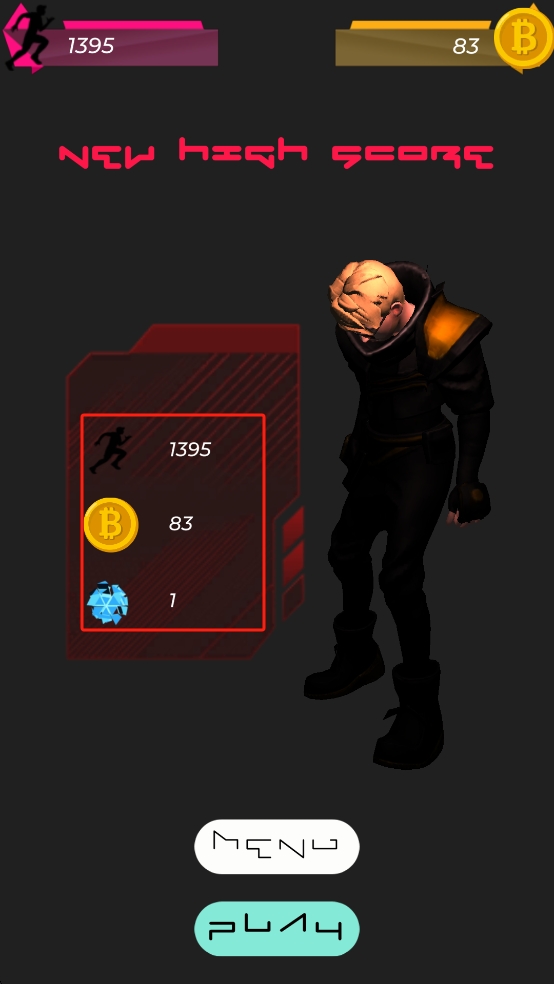 3、关卡结束后,界面展示1395分、83枚比特币及1个道具,点击Play按钮重新挑战,积累资源刷新高分。