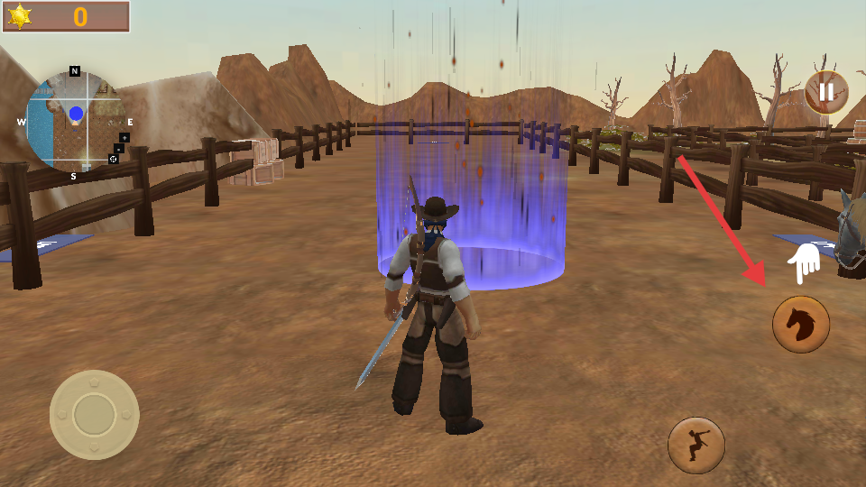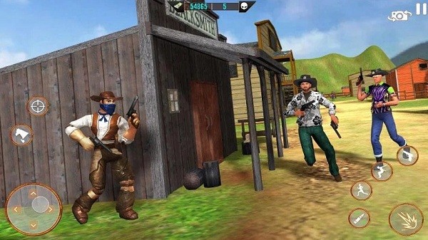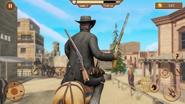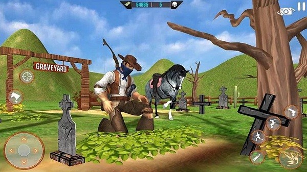 1、通过虚拟摇杆控制牛仔移动,右侧按键完成射击、跳跃等动作。