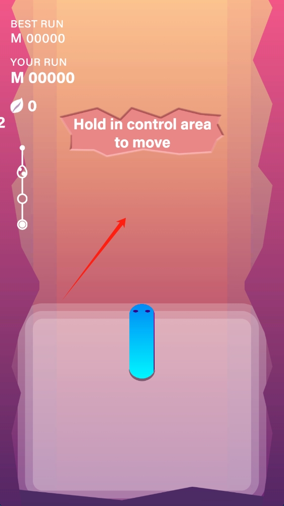 1、启动界面,按住控制区域,操控蓝色长条角色移动,开启跑酷挑战,滑动开始游戏。
