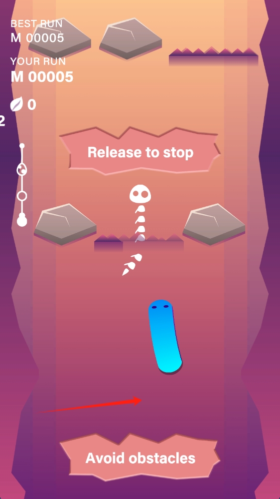 2、跑酷界面,依据Release-to-stop和Avoid-obstacles提示,灵活操控角色,躲避障碍。