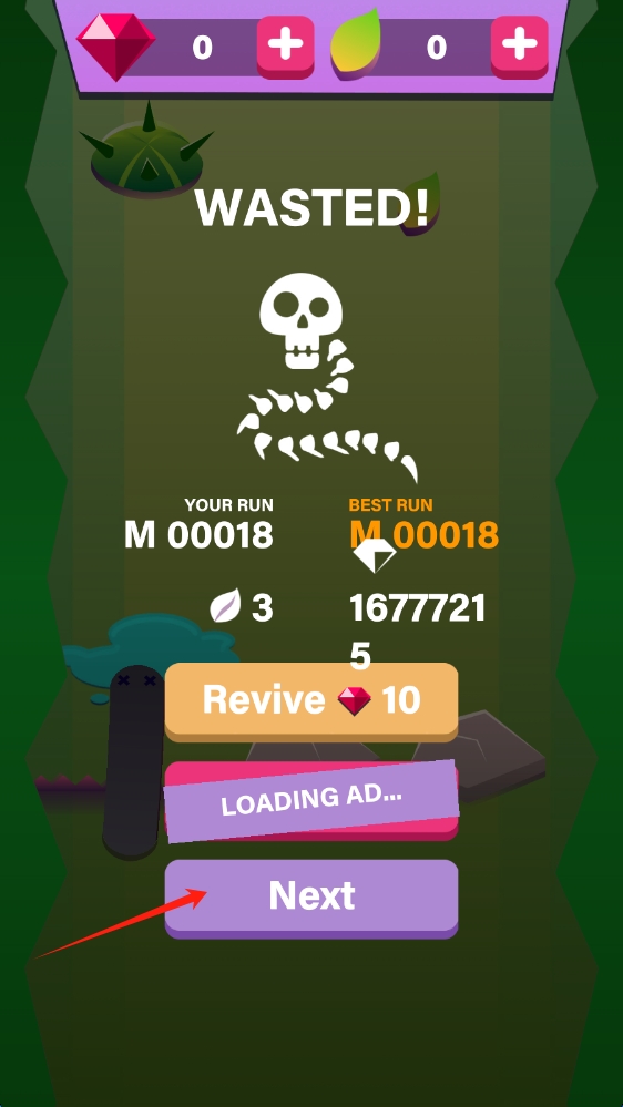 3、失败界面,选择Revive用钻石复活或点击Next,重新开始跑酷,挑战更高分数。