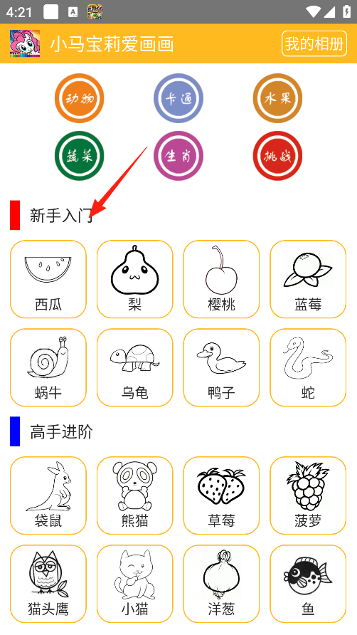 1、打开小马宝莉爱画画,在首页选新手入门里的图案,像西瓜蜗牛这些,选好喜欢的图案,进入画室,就能开始给简单线条画填色,慢慢熟悉画画流程,体验填色乐趣。