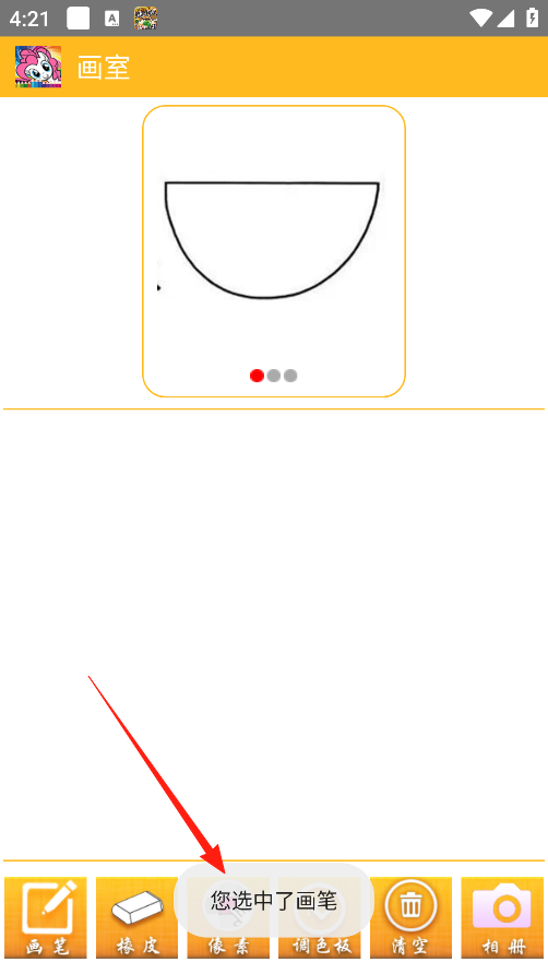 2、进入画室,下方工具栏选画笔工具,拿着画笔,沿着图案线条涂颜色,想换工具就点橡皮像素这些按钮,画错了用橡皮擦掉,灵活调整,把图案画得漂漂亮亮。
