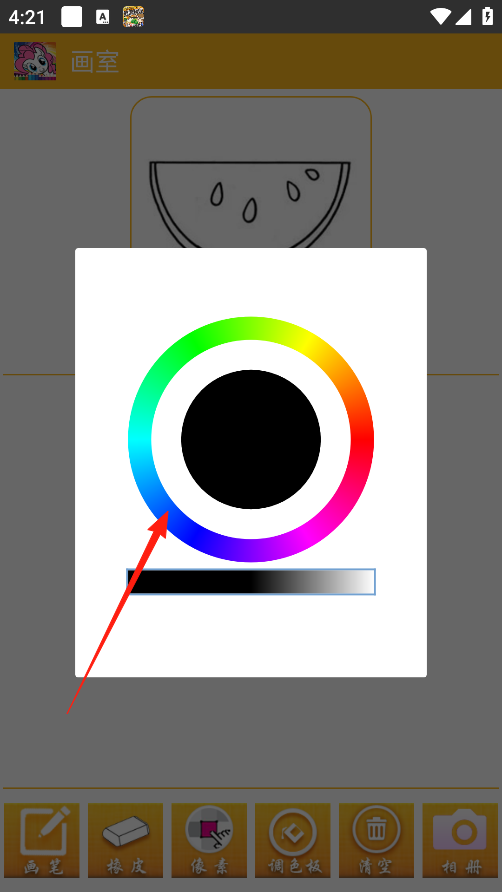3、点调色板弹出颜色轮盘,滑动轮盘选喜欢的颜色,比如蓝色红色,选好后回到画布,用画笔给图案填色,搭配不同颜色,让画的图案更生动,发挥创意,画出独特作品。