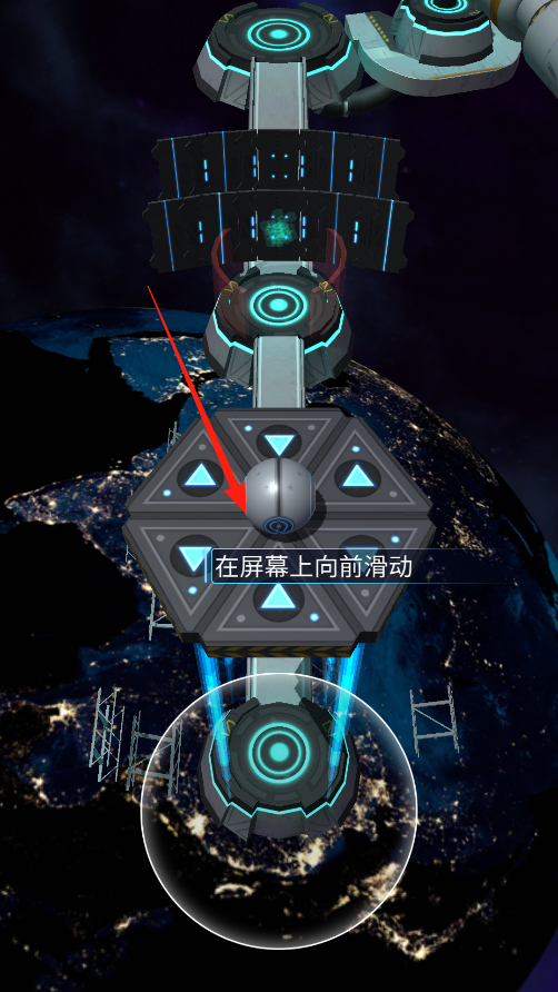 3、来到操作环节,屏幕提示向前滑动,按照指引,用手指在屏幕滑动,控制机器人小球前进,通过滑动操作,让机器人在空间站路径移动,解锁新区域,继续故障排查任务。