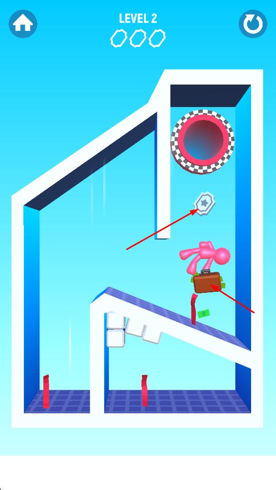 1、进入关卡界面后,操控粉色橡皮人跳跃,收集途中的棕色公文包等物品,这是推进游戏的关键操作,确保顺利开启闯关之旅。