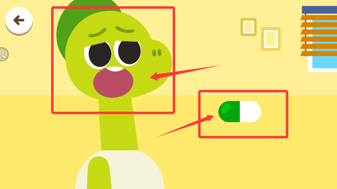 4、遇到生病的卡通小动物时,使用备好的药品为其治疗恢复健康。