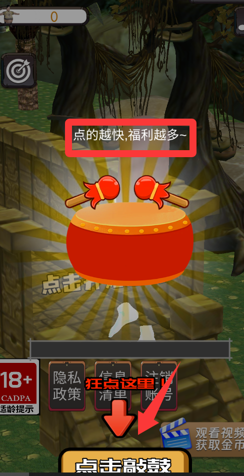 2、进入游戏界面点击敲鼓越快福利就越多。