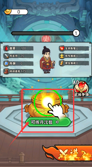 2、在炼药房操作界面,需要点击丹鼎消耗材料进行丹药的炼制。