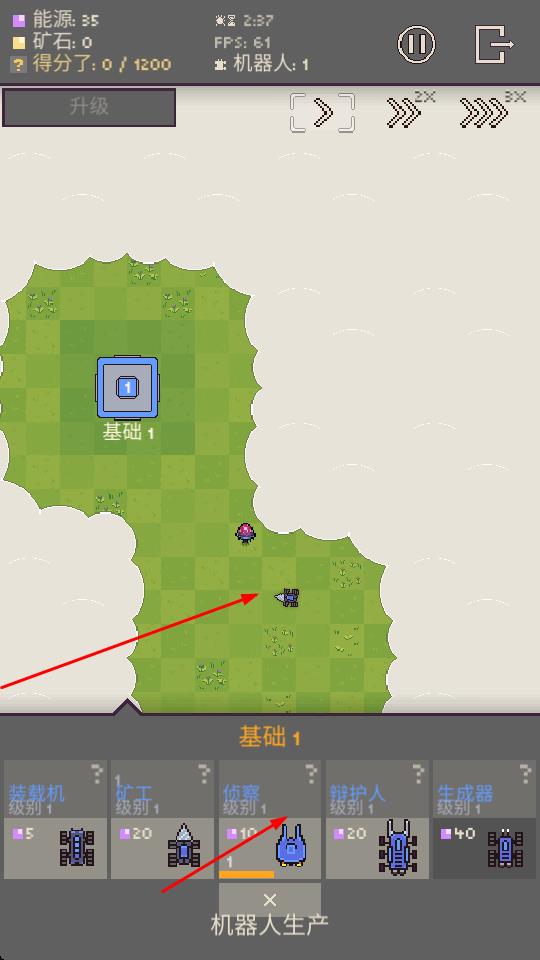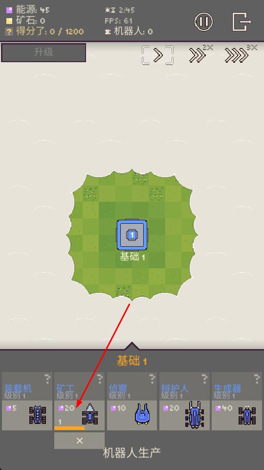 1、首先玩家进入游戏界面,点击下方机器人生产栏如矿工、侦察等,消耗能源制造机器人,组建作战队伍。
