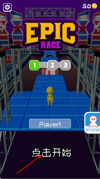 1、进入游戏,在主界面点击点击开始按钮,选择第1关,进入障碍赛跑道场景。