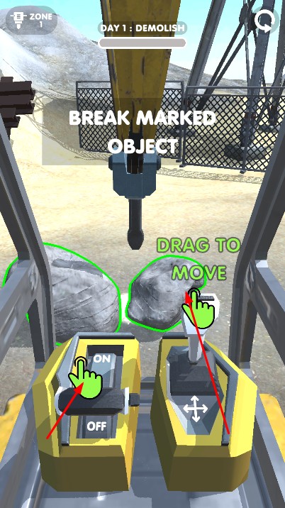 1、熟悉基础操作:进入后,通过虚拟按键控制挖掘机的移动,以及动臂升降,铲斗开合等核心动作,练习旋转车身加调整铲斗角度的基础协同操作。