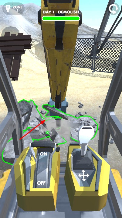 2、在场景中,通过左侧手柄切换ON/OFF开启功能,右侧手柄DRAG TO MOVE控制挖掘机臂移动,让机械臂对准绿色圈定的目标。