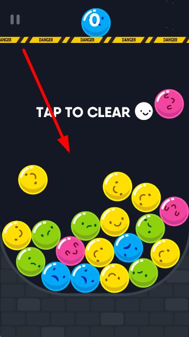 2、在关卡内,按提示TAP TO CLEAR,点击箭头指向区域,消除同色小球,避免危险线下降。
