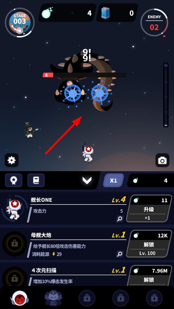 3、持续推进关卡进度,打倒各星系的黑暗势力,解锁新场景与同伴,利用金币更新装备优化策略,不断刷新闯关记录,探索浩瀚宇宙。