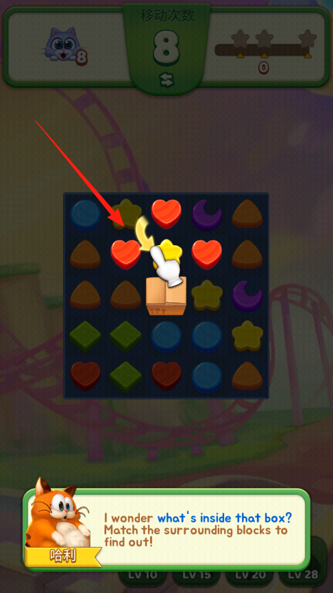 1、进入消除关卡,看到中间有个盒子,周围是彩色方块,按照提示,把星星形状的方块和爱心方块交换位置,凑成三个一样的,就能消除,还能打开盒子,看看里面藏啥惊喜。